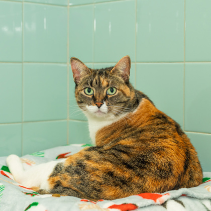Annmarie is a lovely calico with a soft, affectionate personality. She’s a total charmer – she’ll wind around your legs, lean in for more pets, and even tap you politely with her paw when she’d like a little extra attention! She’s especially fond of Churu treats and will happily sit with you for a snack-and-snuggle session. Calm, sweet, and people-focused, Annmarie is the kind of companion who makes every day feel a bit softer.