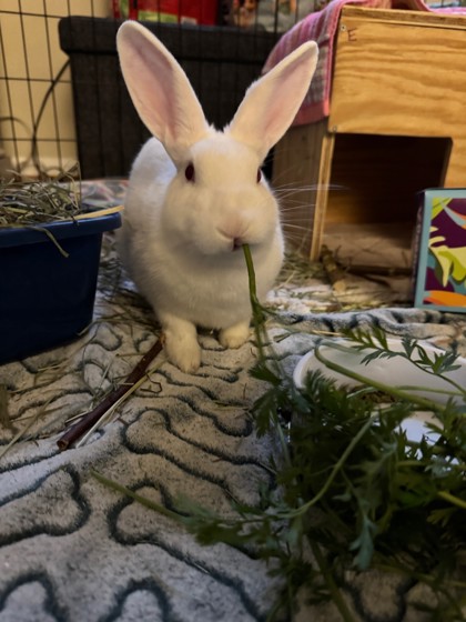 Blanca is a sweet, friendly young bunny. She loves lettuce, cilantro, and all kind of greens. She is litterbox trained and has excellent house manners. Blanca likes kids and gives kisses to all her favorite people.