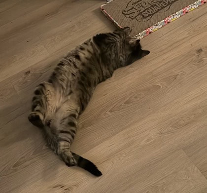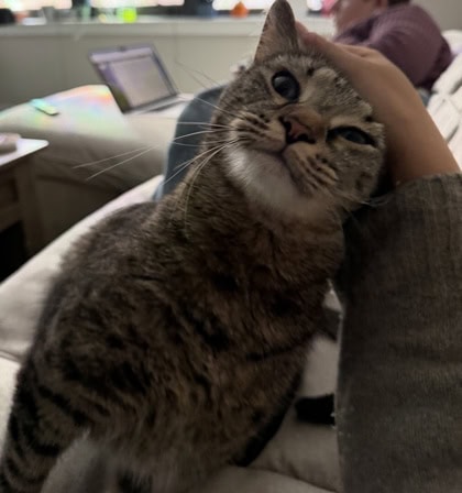 His favorite things are chin scritches, Churu treats, and having free reign to explore. You can often find him hanging out underneath the couch, but he also loves cuddling on top of it. When he wants attention, he announces his presence with little chirps. He’ll express his affection with headbutts, flopping over to snuggle up by your side, and a surprisingly loud purr.