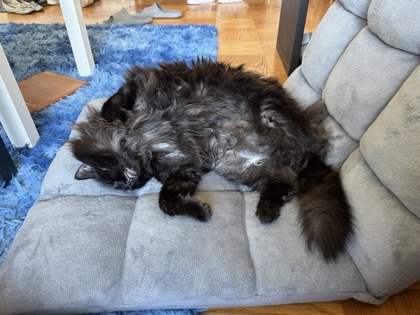 During the day, Chloe enjoys hanging out on the couch or watching the world go by from her new cat tree. She likes to alternate which family member gets the pleasure of her company overnight and is not shy about waking her foster mom up in the morning for some attention. Chloe reportedly is a bit of a “meower,” which makes her great at communication.