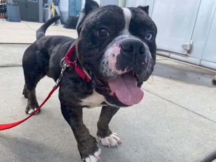 Fetti may look like he’s ready for the ring, but his heart is pure gold! This lovable tough guy has become a total favorite here at the shelter – he wins everyone over with his charm, goofy grin, and big personality. Fetti is super friendly and absolutely loves being around people. He’ll happily soak up your attention, and if you happen to have a treat (any treat!), you’ll have his full focus – no questions asked. He’s also a big fan of stuffed toys, proudly carrying them around like trophies.