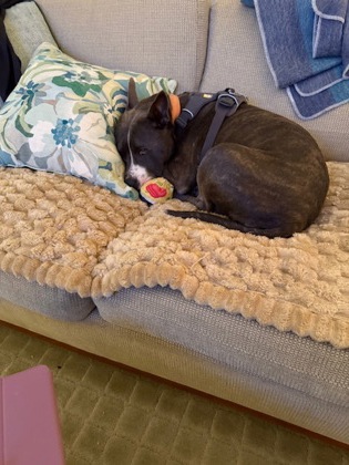 “Howie is very easy to have around the house. He sleeps a lot of the day – sometimes near you, sometimes in a nice sunny spot. Howie does love the occasional game of tug or war and is very serious about keeping the yard clear of squirrels and other invaders. He’s fully house trained and can be left alone without a problem – he’s not at all destructive.”
