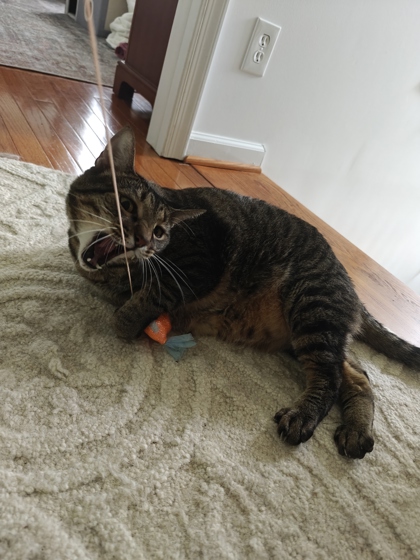 Kit Kat isn’t a fan of lots of petting as he likes affection on his own terms. He can get overstimulated during intense play or too much touching, so he’s looking for a home that truly respects his boundaries and reads his signals.