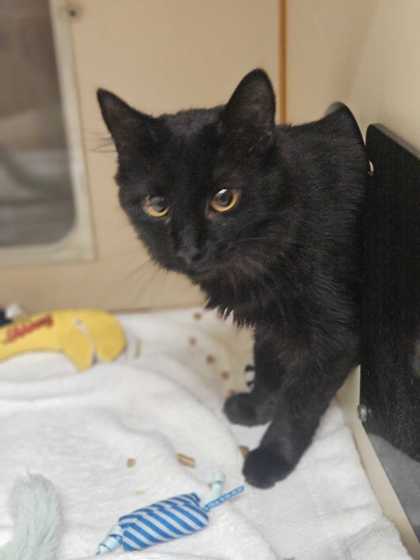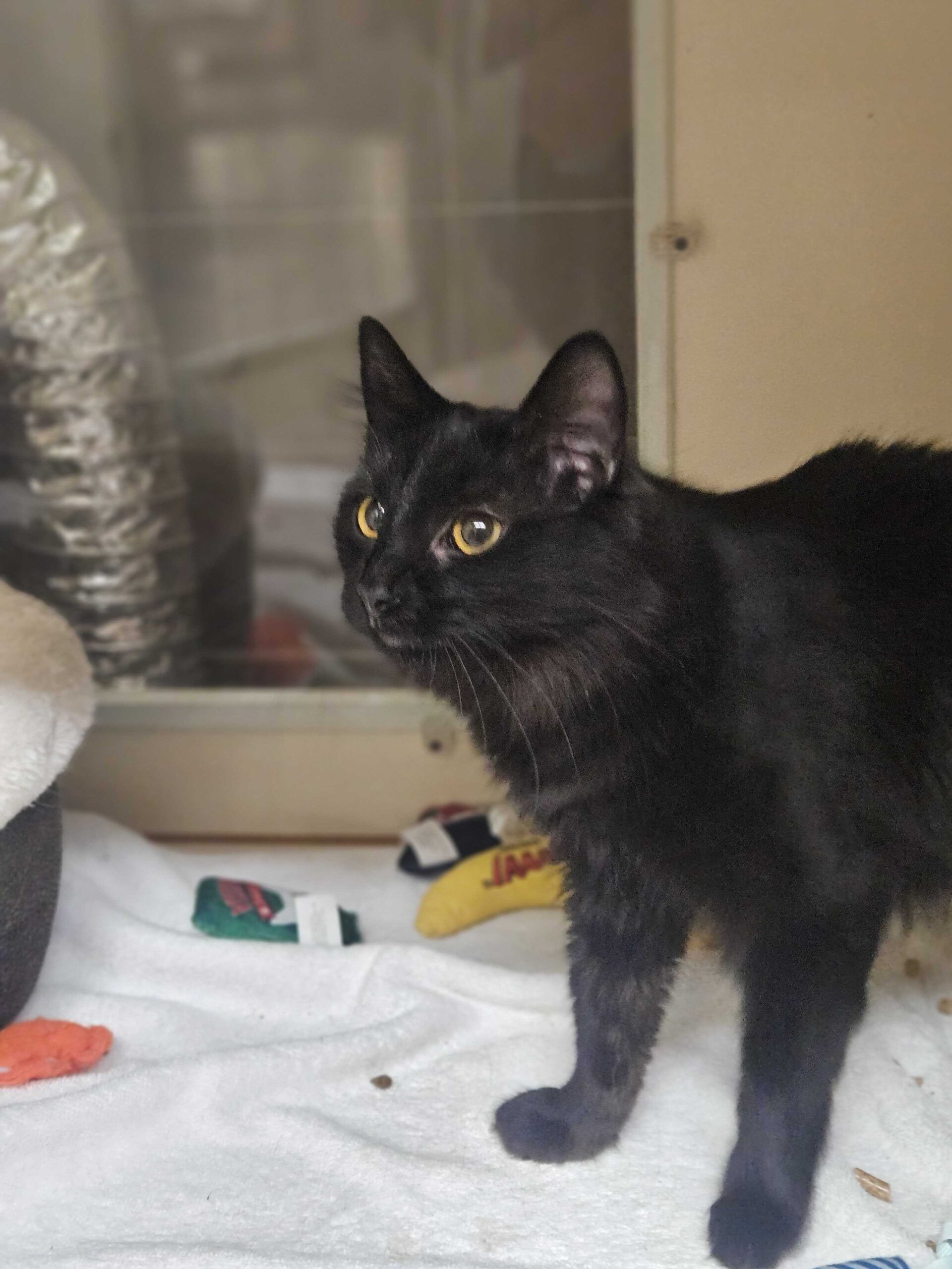 Leno is a handsome medium-haired black cat with a gentle spirit and a blossoming playful side. He may be a bit shy when he first meets you, but give him a little time and patience, and you’ll see his sweetness shine through.