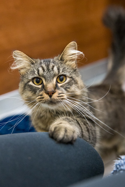 Despite being named Tiger, this handsome fellow boasts a striking resemblance to a lynx with his stunning tufted ears and captivating gaze. Don’t let his lynx-like appearance fool you – Tiger is a gentle and affectionate companion at heart. His favorite pastime is curling up in a cozy spot beside you, purring contently as you stroke his luxurious coat. With his soft, plush fur and endearing mannerisms, Tiger has a way of melting hearts wherever he goes.