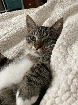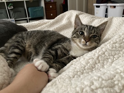 She will make you work for her trust. Although, that trust can be slowly gained by having her favorite treat. She doesn’t like to be picked up but secretly loves pets and snuggles. You’ll know you’ve won when she starts purring, only to immediately shoot you a look of betrayal and run away, just in case you thought she was enjoying it. While she’s not bonded to her brother, she does need another cat who likes other cats in the house. She spends her days trailing the resident cat, seeking comfort and cuddles when life gets too stressful.