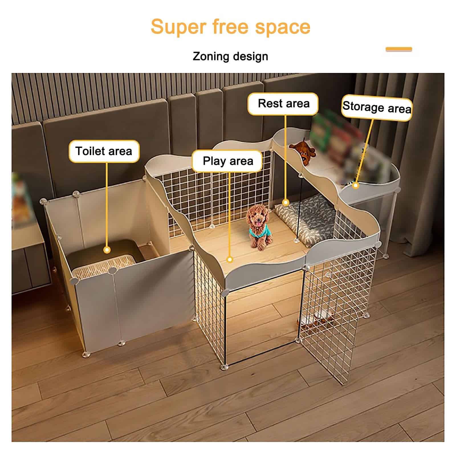 - Comfortable rest area (crate with soft bedding)(if they aren’t crate trained yet, remove the door to prevent them from accidentally being locked inside)